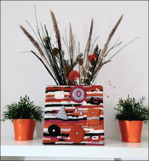 gehäkelt mit Wolle, designt mit diversen Materialien.